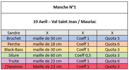 Les espèces comptabilisées pour cette manche seront : La perche, le brochet, le chevesne, le black Bass, le silure et la truite.