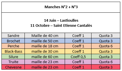 Les espèces comptabilisées pour ces 2 manches seront : La perche, le sandre, le brochet, le chevesne, le black bass, le silure et la truite.