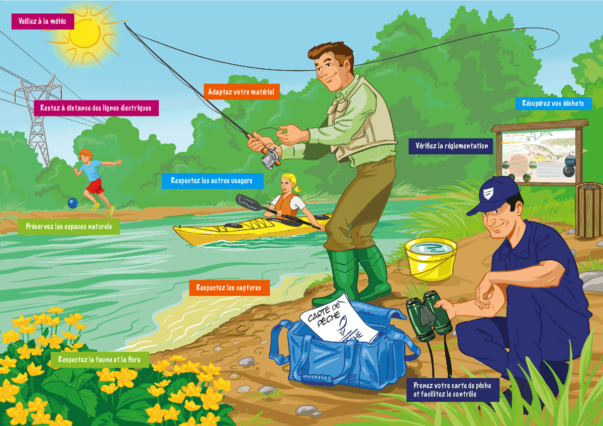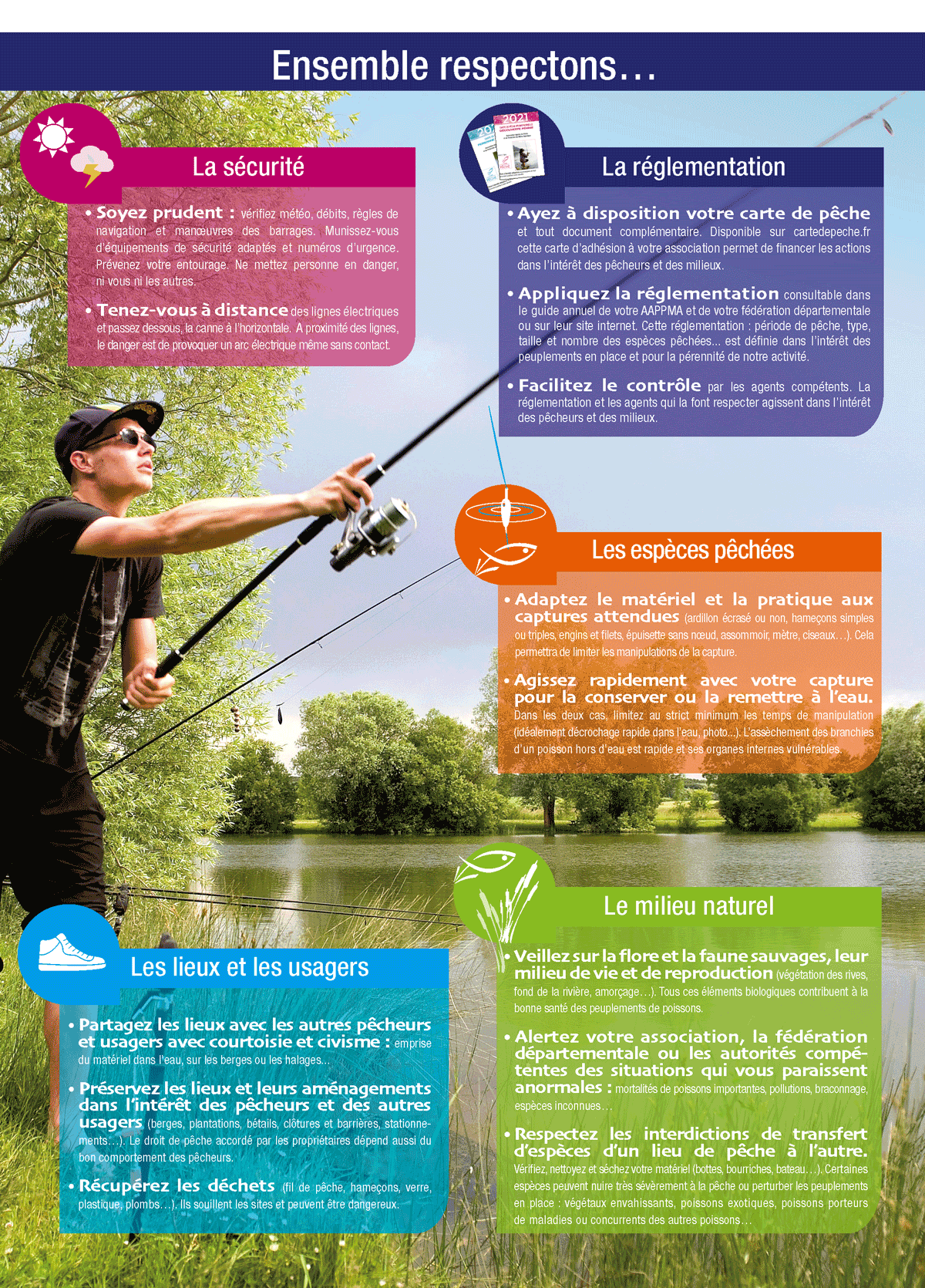 La pratique de la pêche implique, sous la responsabilité de chacun, l’adhésion aux valeurs véhiculées par les structures associatives de la pêche de loisir dont le respect de la sécurité et de la réglementation, du milieu naturel, des espèces pêchées, des lieux de pêche et des autres usagers (pêcheurs et autres).